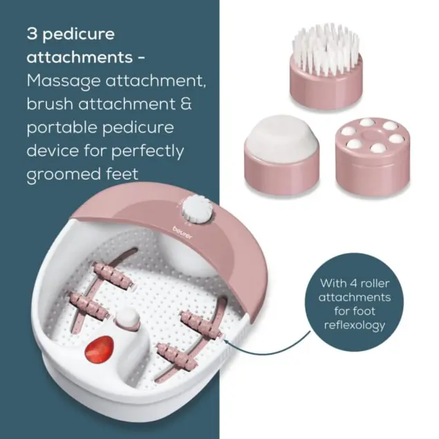 A Beurer FB 20 láb-pezsgőfürdő nemcsak a relaxációról, hanem a lábápolásról is gondoskodik. Három funkciója – vibrációs, pezsgőmasszázs és víztemperálás – mellett infravörös hőhatással és cserélhető pedikűr feltétekkel teszi teljessé az otthoni wellness-élményt. A praktikus kialakítás, a levehető görgőfeltétek és a csúszásmentes gumitalpak kényelmes és biztonságos használatot biztosítanak.