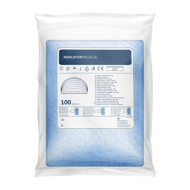 Kék flíz anyagú, körgumis, összehajtogatott. 1 csomag 100 db nővérsapkát tartalmaz.