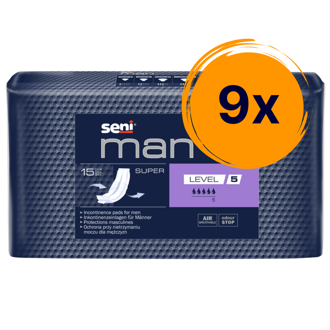 A Seni Man Super Level 5 légáteresztő betét hatékony védelmet nyújt az enyhe és mérsékelt vizeletinkontinenciával érintett férfiak számára.