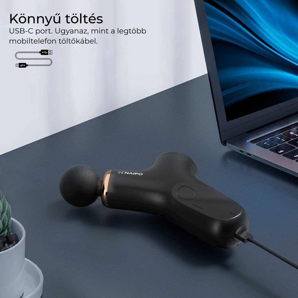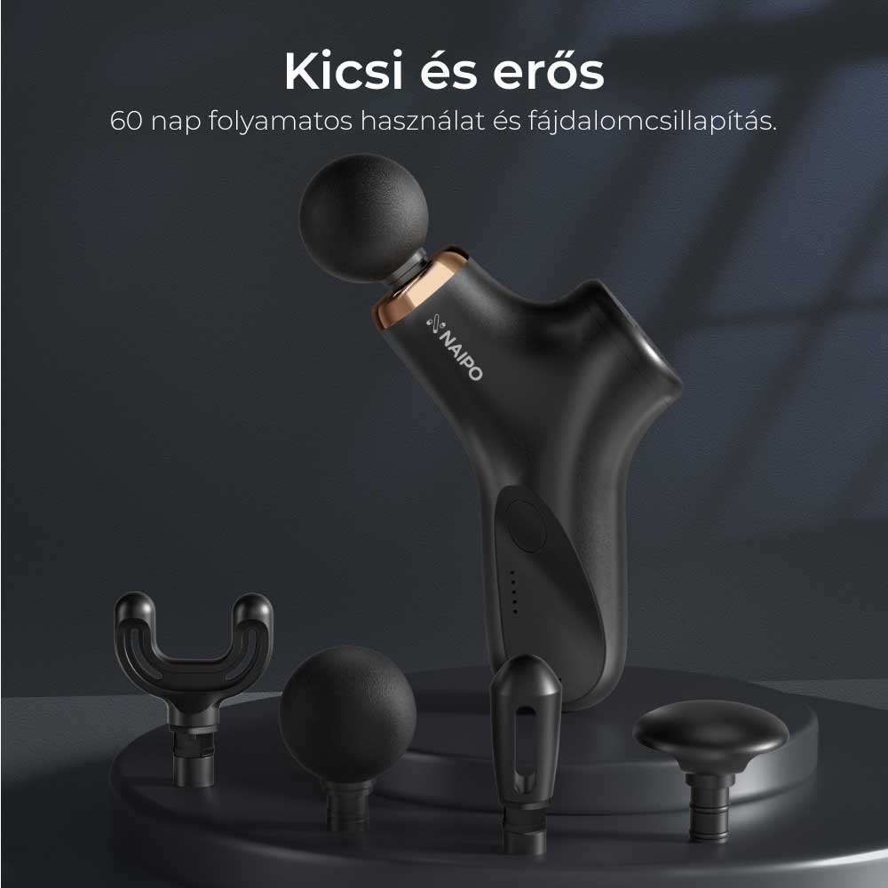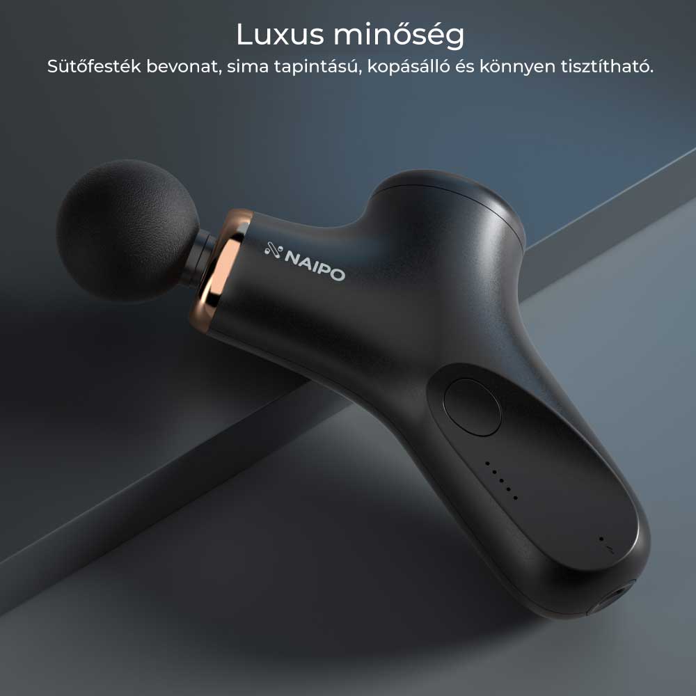 A NAIPO legújabb mini masszírozópisztolya homorú formával, 1 db érintőgombbal az összes funkció kiválasztásához, kényelmes és könnyed kezelést tesz lehetővé.