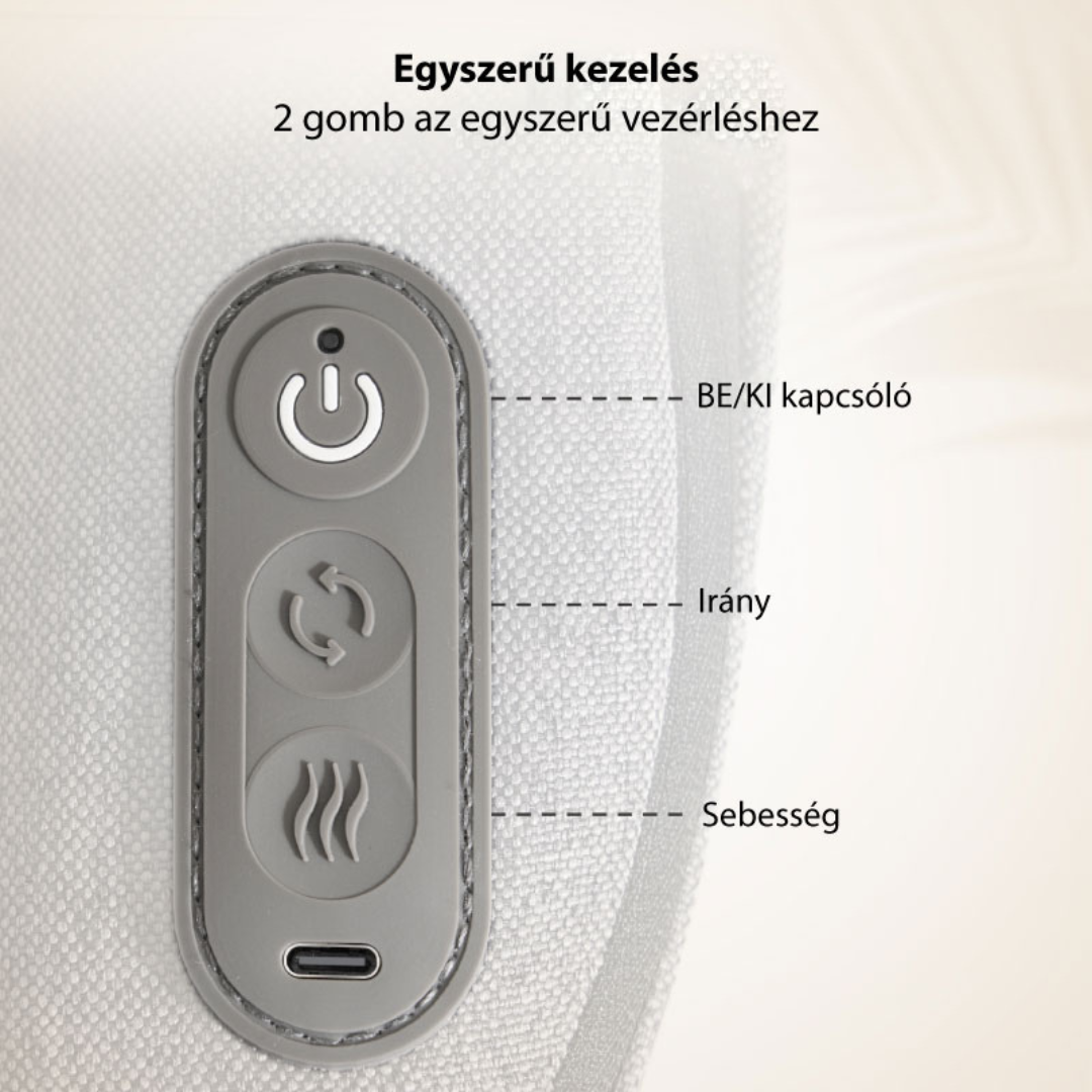 Három intuitív gombbal vezérelhető: be-/kikapcsolás, irányváltás és sebességállítás. A készülék 15 perc után automatikusan kikapcsol, így biztonságosan használhatod hosszabb pihenések során is.