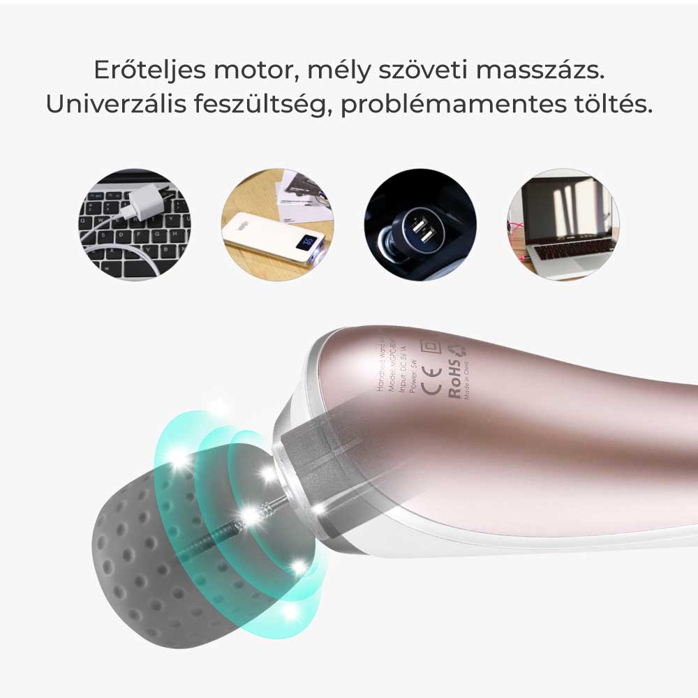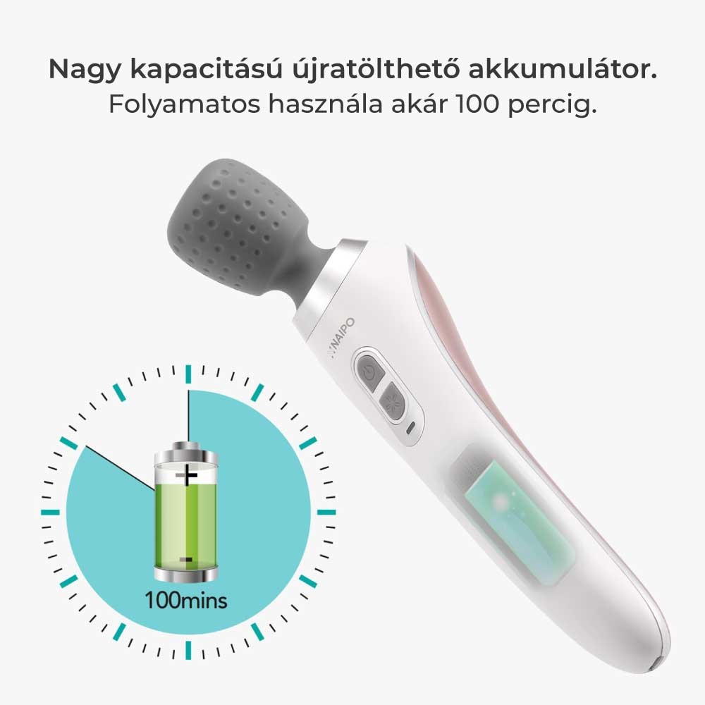 - 2-3 óra töltés után 100 perc vezeték nélküli masszázst képes biztosítani (töltés közben nem használható).