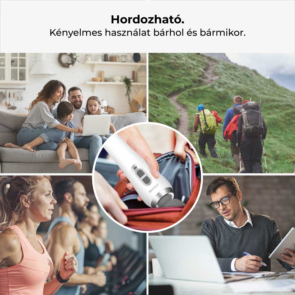 - A könnyű személyi masszírozó (312 g) könnyen elfér akár egy kézitáskában, és bárhová magával viheti egy kellemes masszásra: otthon, munkahelyen, edzőteremben vagy útközben;