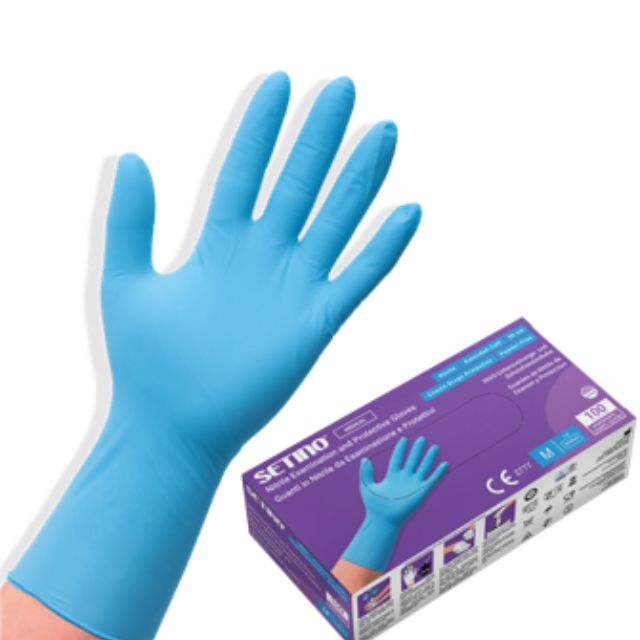 Setino prémium minőségű, hosszú szárú, púdermentes nitril kesztyű, latexmentes kialakítással. Allergiamentes, CE tanúsítvánnyal és SGS teszttel. 100 db/doboz.
